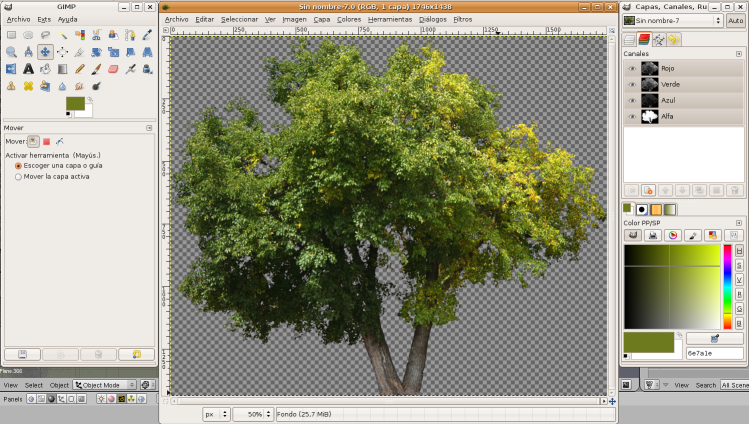 Yo lo que quiero conseguir es una imagen del árbol en cuestión, que guarde el canal alpha, y que además conserve el color de fondo verde para evitar el desagradable efecto que provoca el recorte en los bordes. Yo esto es algo que hacía con Adobe Photoshop sin ningún problema. Es decir, yo, en mí psd podía tener unas cuantas capas y, además unos cuantos canales guardados, que se mantenían invariables, para poder usar dichos canales o selecciones a voluntad, en el momento que me diera la gana.