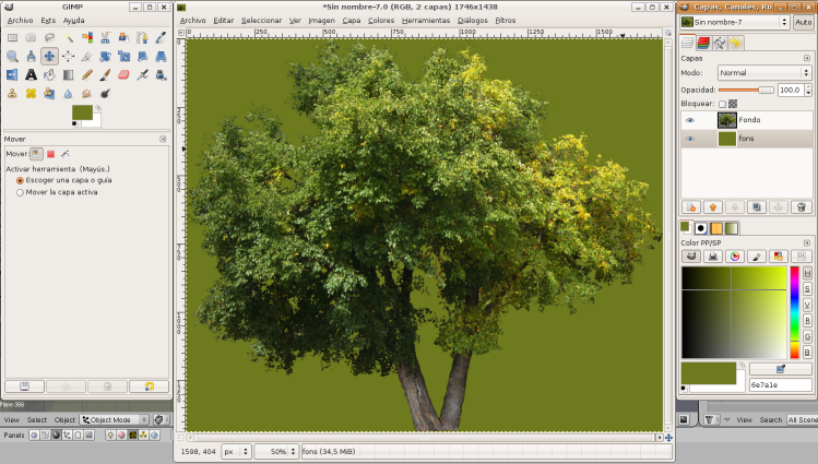 Ok, la solución es el Targa. Ahora bien, el resultado es horrible como podéis comprobar. Yo, antes, cuando me pasaba esto en 3dsmax, iba a Adobe Photoshop, calaba la selección un pelín y, además, hacía que el fondo de la imagen en cuestión fuera de un color muy similar al de la copa del árbol, en vez del negro (o blanco) que viene por defecto. Puedo hacer lo mismo en Gimp? Es que no hay manera de rellenar de color y que me guarde el canal alpha.