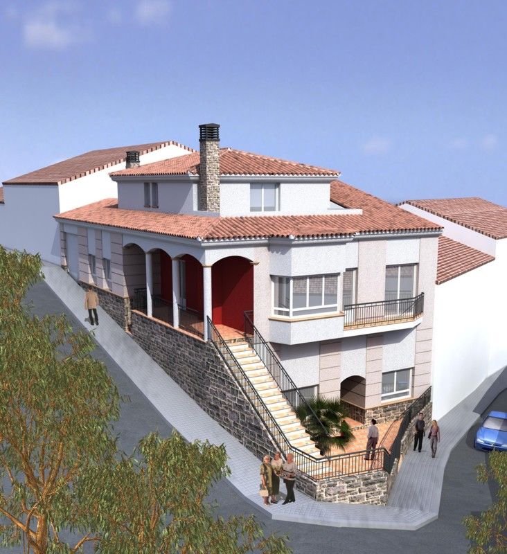 El modelado de la casa es muy bueno, como ya te dijeron, las casas vecinas se ven muy mal, me imagino que lo hiciste con la intención de que solo resaltara la casa centra (o tal vez para ahorrarte trabajo, sin duda mejorando esto quedaría mucho mejor. La banqueta está demasiado geométrica y recta, creo que nunca he visto una banqueta así antes, sin duda tienes que suavizar. Las personas, creo que deben irse, o si el cliente te las pide, pues las mejoras porque no se ven nada bien.