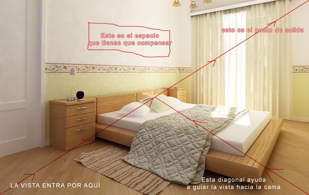Las líneas de fuga dirigen la vista hacia el punto de interés de la escena. Tu no te das cuenta, pero tus ojos siguen involuntariamente esas líneas. Por eso es importante que sigan un sentido lógico. En tu escena se concetra el peso en la parte inferior derecha. La vista entra por abajo a la izquierda, sigue por la cama y se va por la caja de la persiana. Como esta no sigue correctamente las líneas de fuga, molesta el espacio de pared que hay a continuación. También tienes que compensar el peso que tiene una parte de la imagen con el vacío que queda en la otra. Si pones un cuadro sobre la cama lo solucionas fácil. Te adjunto un pequeño croquis explicativo.