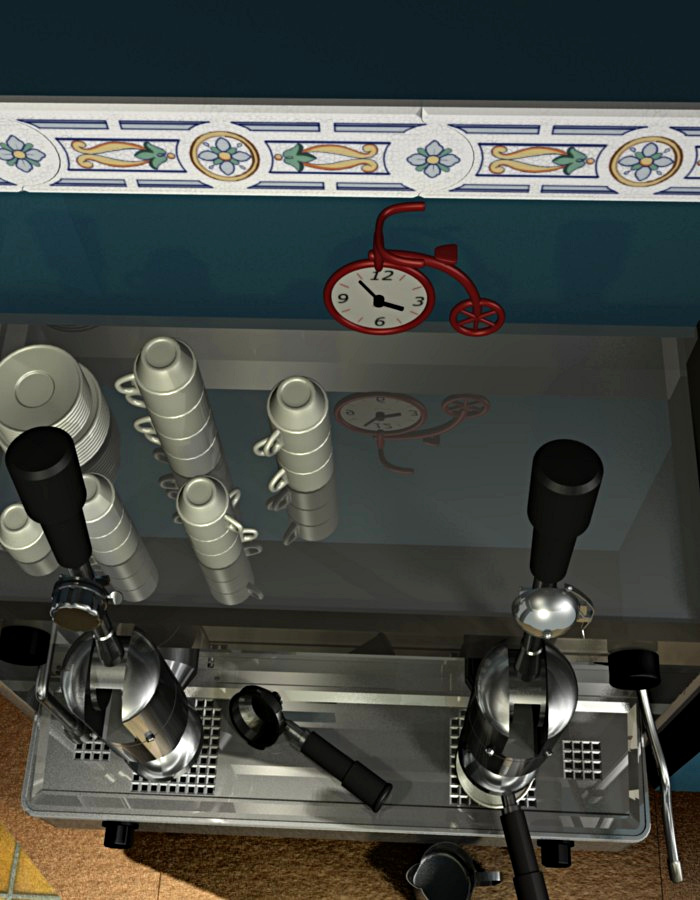 Esta cafetera, existe y ya ha suscitado la creación de otras obras gráficas, - Siempre inspiradas por temática ciclísta, alguna de las cuales pensé incluir en la escena, pero por las cosas de los derechos de autoría y posibles heridas en otas susceptibilidades, he cambiado el libreto y solo incluiré alguna cosa de mi almacenillo, que para eso lo tengo.