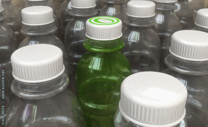 Muy, muy realistas (que me imagino era tu intención) solo una cosa, y no estoy seguro, pero creo que, el brillo más fuerte (que parece una lampara) no debería repetirse en el mismo lugar para todas las botellas, veo que, en todas el brillo es casi igual.