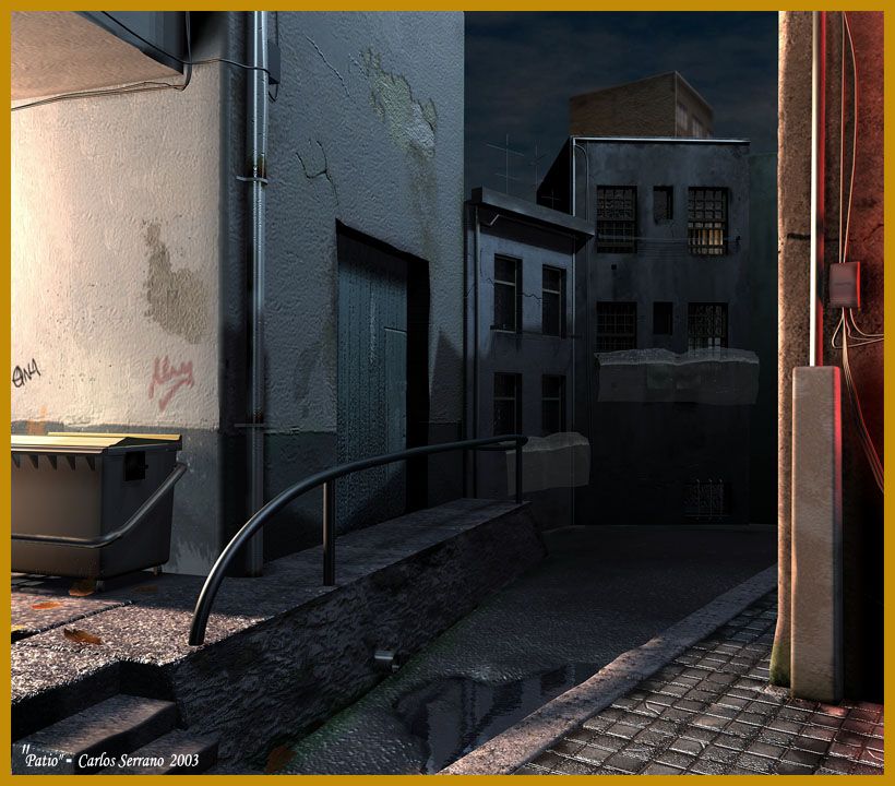 Hola. Este es mi nuevo render. Se trata de un patio producto de mi imaginación. Es una escena casi nocturna. Espero que os guste y me deis vuestra opinión. Renderizado con 3dstudio Max 4.2. Saludos.