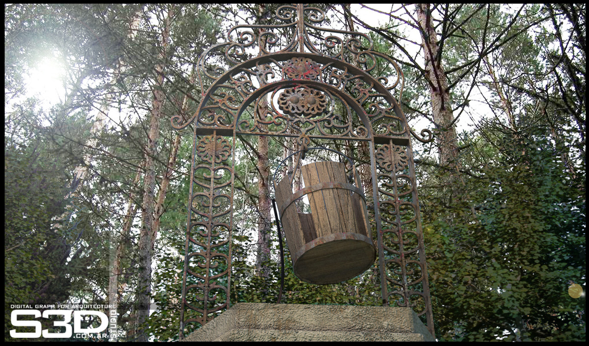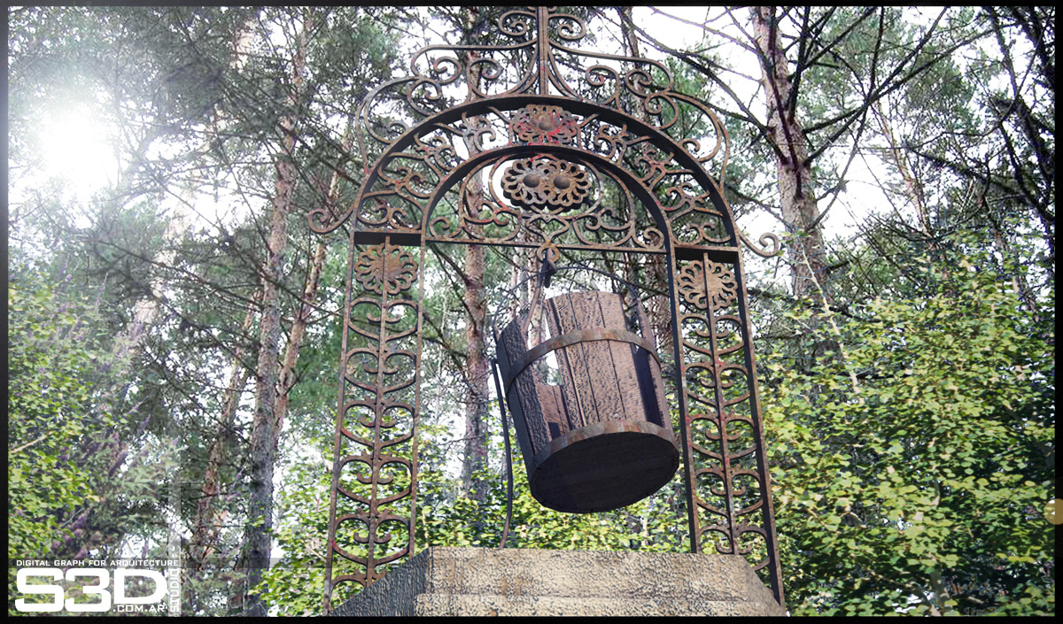 Independientemente de lo que ya te han comentado sobre la textura de la madera, yo lo que veo es que tienes la iluminación al revés, es decir, tienes un golpe de luz muy fuerte que entra por la izquierda, entre los árboles, como si el sol estuviera en ese lugar (que de hecho, creo que está ahí), pero luego veo que has iluminado la escena por la derecha, y esto hace un efecto muy extraño, te deja la imagen muy plana. Deberías tener en cuenta la luz que entra por los árboles, y si acaso iluminar tenuemente por la derecha, a modo de IG. Saludos.