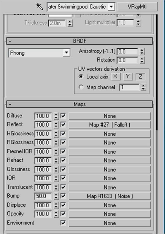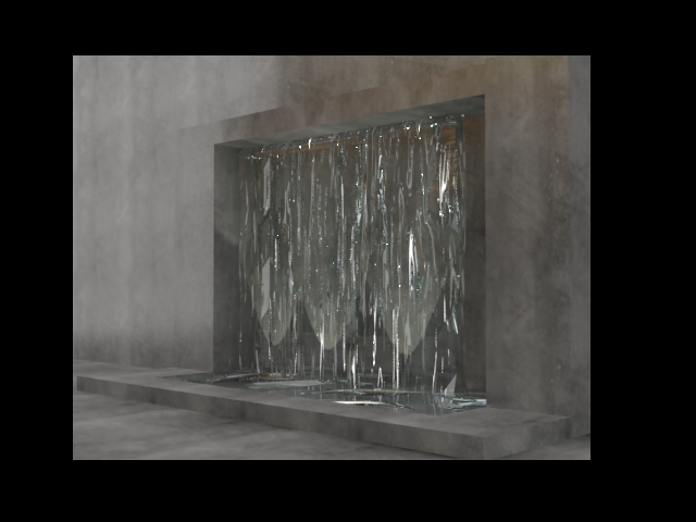 Hola. Creo que antes que nada debes modelar bien el agua para que cuando configures Bump y cáusticas se logre la apariencia buscada. Estas cortinas son una serie de pequeños chorros, así bajen pegadas al muro se deben ver cómo tal. Antes parecía una piscina vertical y ahora parece que el agua corre hacia los lados.