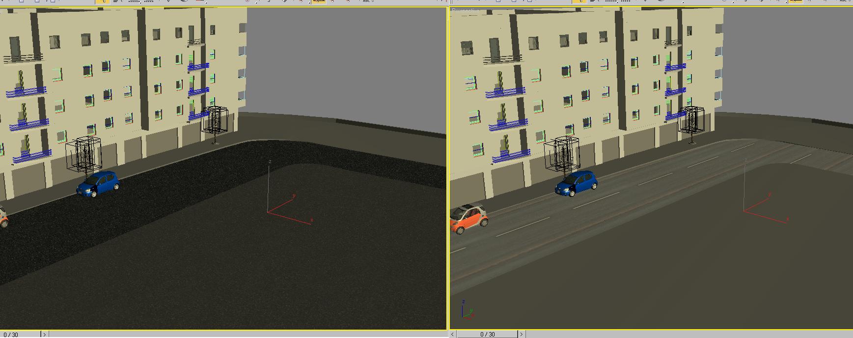 Creo que no me he explicado bien lo siento, veras en la imagen que te adjunto de la izquierda es la calle que he modelado, al lado del edificio que también he modelado, esta modelada la calle mediante una Spline siguiendo el recorrido que debe llevar y mediante el modificador extrude para hacerla visible y poder texturizarla, después la captura de la derecha es con un material Vray de asfalto con un mapa de carretera, eso es lo que me refiero como puede adaptarse a la forma de la carretera, solo se puede hacer con Unwrap, o de la forma esta que dicen mediante hacer un Loft se puede y no ha que Unwrapear el objeto.