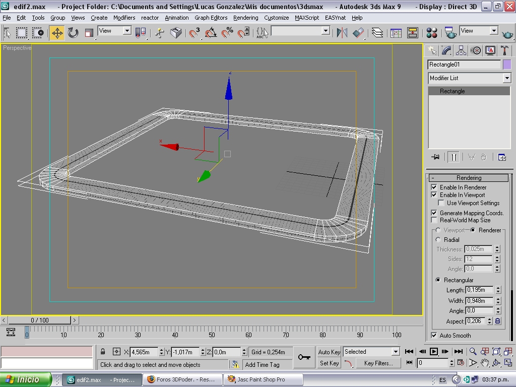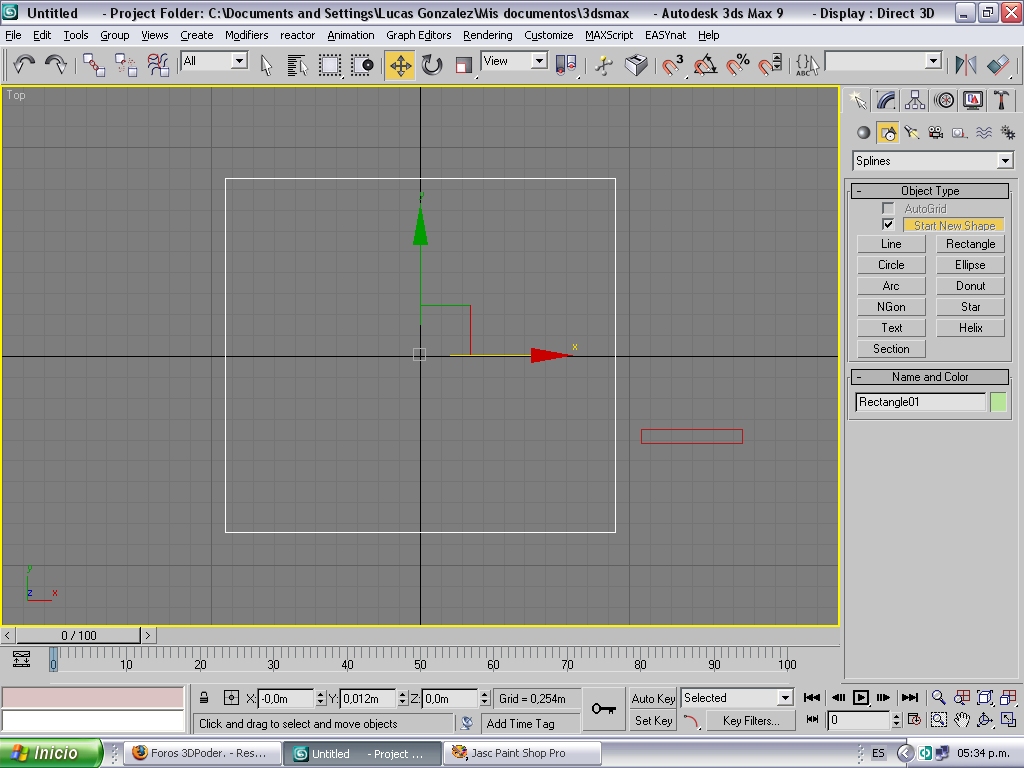 Vamos a la lengüeta create, shapes, seleccionamos rentangle y creamos 2 rectángulos en la vista superior, una grande (que será el recorrido) y otro más chico (que será la sección) te tiene que quedar parecido a la figura1.