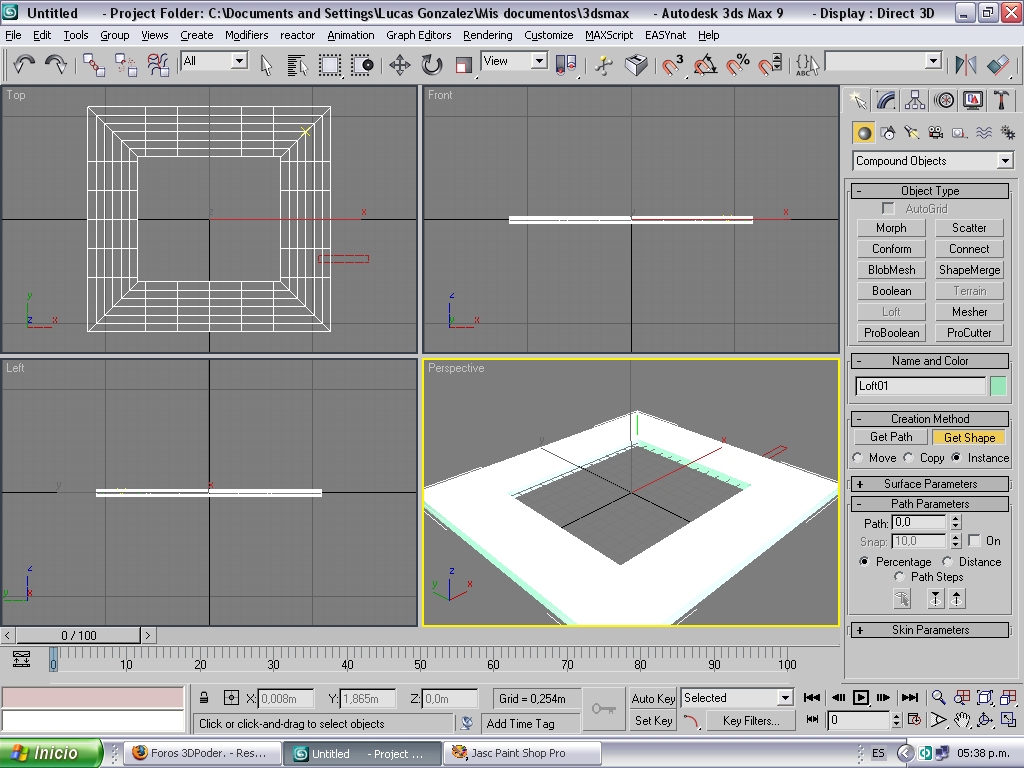 Luego seleccionamos el rectangle grande (el recorrido), vamos a create, geometría, cambimos el estándar primitives por compond (*.obj), precionamos en Loft, luego con el recorrido seleccionado, precionamos get shape, y cliquiamos la sección y listo.