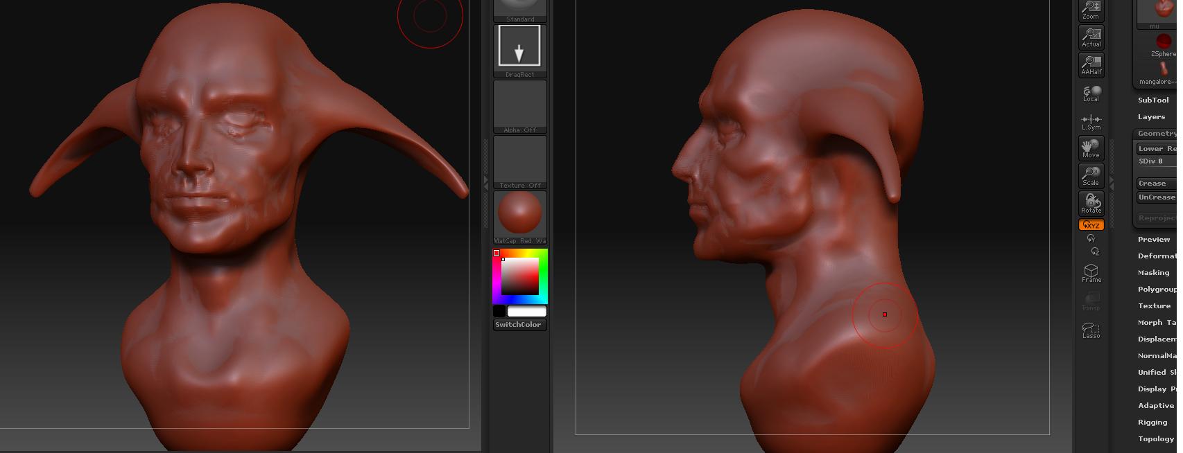 Bueno, después de hacer infoarquitectura y mi último trabajo de Batman en 3d Studio 9, intenté darle caña a ZBrush para aprender a utilizarlo, y nada después de un día viendo un par de tutoriales, con una Z-sphere, esto es lo que me ha salido a ojo, tengo algunos fallos, algunos bollos que debo correjir, pero para ser de memoria no está mal para ser el primero. A ver si me ayudáis a mejorarlo, hace tiempo probé a utilizar el 2.0 y tenía dos herramientas llamadas Smooth y otras de trasform que estoy seguro que ahora me ayudarían a corregir esos bollos y tamobien la herramienta move no se comporta como la 2.0, tengo la versión 3.1, a ver si me echáis un cable, bueno saludos.