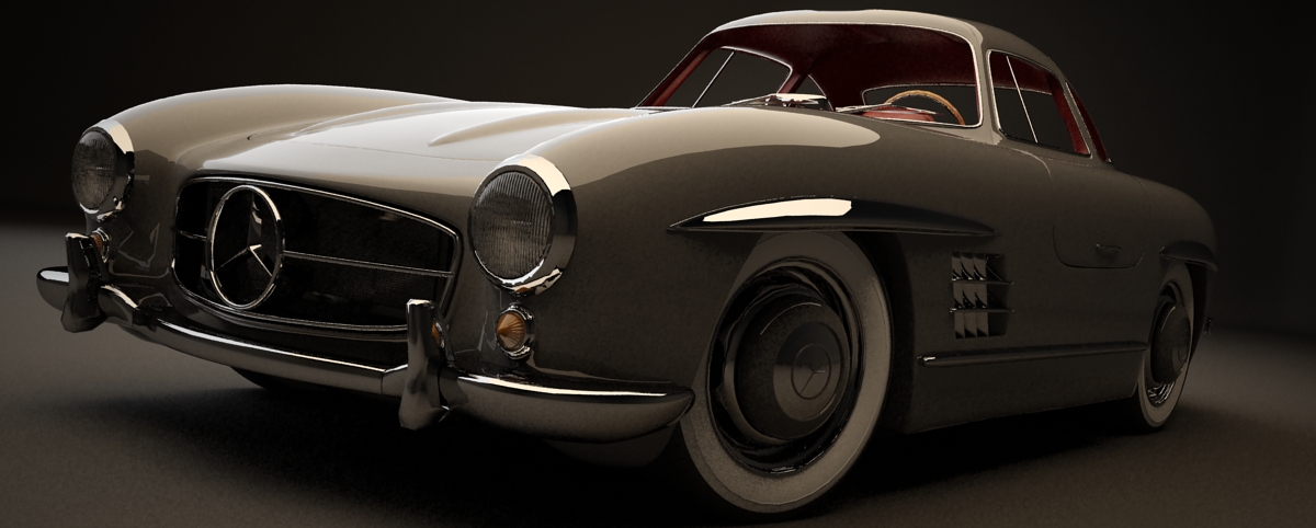 Muy bonito el auto, me gusta mucho la ambientación. Una buena imagen de este 300sl como el gullwing sería la imagen típica con las puertas levantadas, pero bueno es solo mi opinión. Mi única crítica es que no tiene parabrisas ni ventanas, pero es lo único que le faltaría para un toque más de realismo. En resumen, muy buen modelado e iluminación. Saludos.