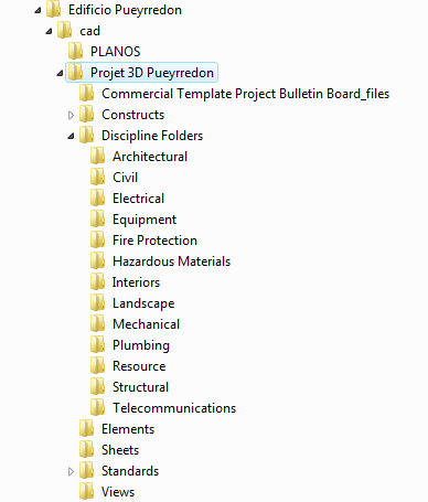 Esta es una captura de cómo el AutoCAD architectural organiza las carpetas y archivos con su, Project management. Obviamente esto es personalizable, pero básicamente en la carpeta construct se organizan los diferentes archivos que tiene un proyecto de arquitectura, por lo general estos archivos se separan por nivel, es decir, planta baja, primer piso, segundo piso etc, y también por divisiones, o zonas, sector a b c. Dependiendo de la magnitud del proyecto, luego todo esto se inserta en un archivo común como un Xref, y allí se generan las vistas y secciones, que van a parar a las otras carpetas, todo supuestamente referenciado con la maqueta 3d. Todo esto en teoría porque lamentablemente cuesta bastante manejarlo, y siempre tiene muchos errores, ahora estoy comenzando a estudiar el programa Revit, parece que está mejor. Pero el tema aquí es la organización de archivos, y AutoCAD architecture, (el viejo ADT, o architectural desktop), trae incorporado esto, quizás nos ayude o salga alguna idea.