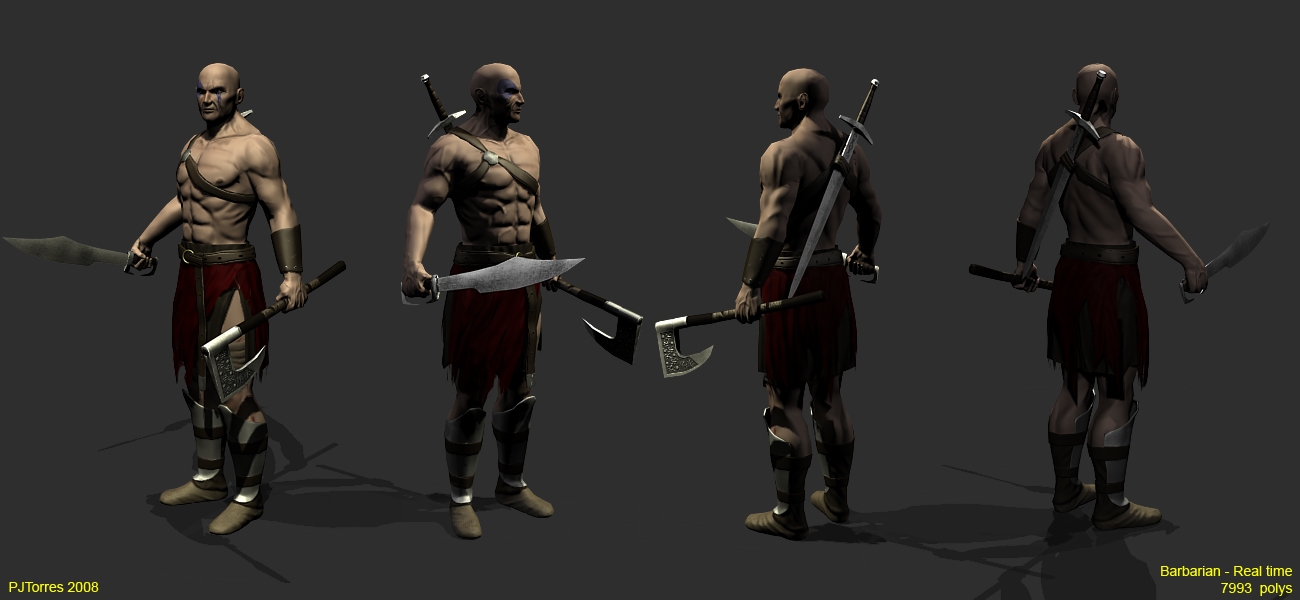 Respecto al proceso, sí que es laborioso, y cada vez más porque así lo permiten las nuevas máquinas. El modelado está realizado en 3ds Max, tras ello exporto a ZBrush donde le meto detalle (ni de coña tiene nada que ver con Poser, Poser es una basura que te crea humanoides predefinidos muy feos, ZBrush, Mudbox o programas similares son programas de modelado en alta definición o también se les reconoce como escultores digitales. En estos les damos caña al modelo (no tiene por qué ser un humano, puede ser cualquier cosa) para sacar los mapas de normales que luego aplicaremos al modelo en baja (el que modele en 3ds Max) y lo que conseguimos con ello es una variación de la incidencia de la luz sobre el modelo consiguiendo una gran definición en el modelo ahorrando en polígonos. En Photoshop hice las texturas de la piel, armas. En este caso no tiene nada de postproducción. Saludos, y espero que te haya quedado un poco más claro.