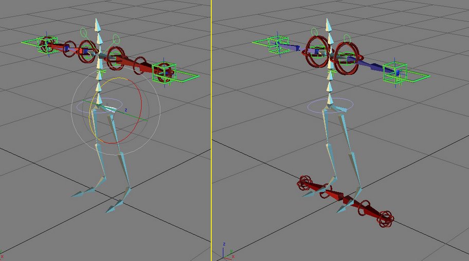 Y el problema es que, si hago que un objeto sea el padre de la raíz del esqueleto en la cintura, la cadena FK de los brazos y sus controladores, se me caen al suelo. Os adjunto un screen.