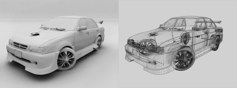 Esta modelado con 3ds Max y polybost (script muy bueno). Aquí les dejo la wire: coche en wireframe.