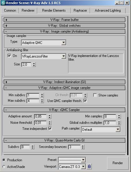 Ahora mismo la calidad es media - baja en render, aunque salen más o menos bien (de todas formas, mira los techos y paredes lejanas, tienen manchas, y en el garaje hay mucha basura en pantalla). (te adjunto dos capturas de los parámetros de Vray).
