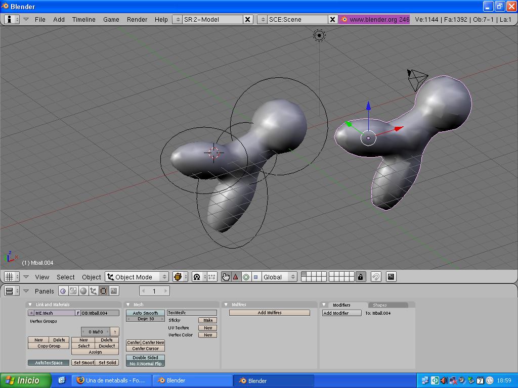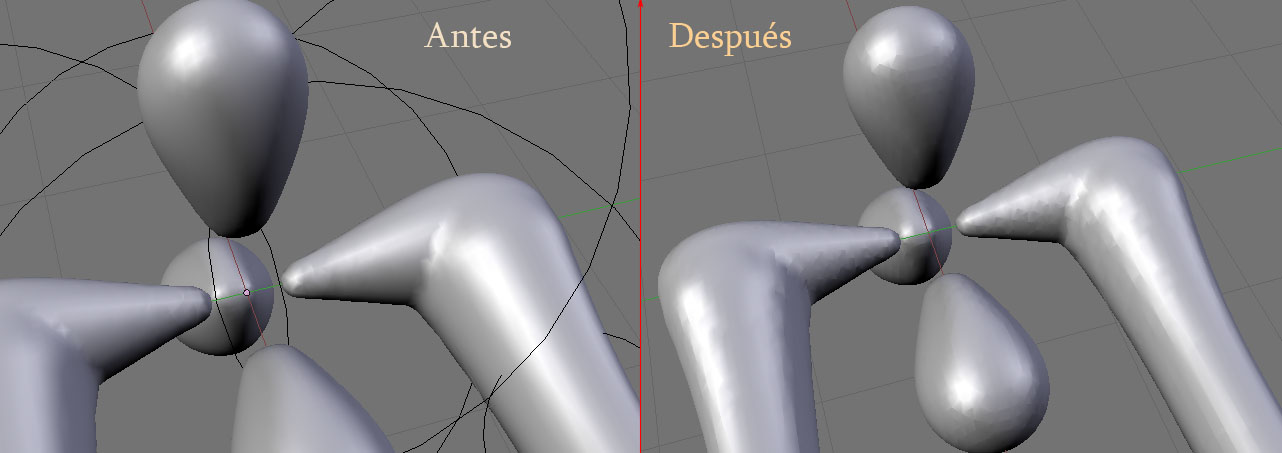 Me estoy cabreando con las metaballs de Blender, porque resulta que al convertirlas a malla se quedan fatal. Os adjunto una imagen para que veáis el antes y el después. El mallado (wiresize) está a 0.05 (el máximo que me permite), así que, no sé qué hacer para que me haga el mallado más o menos decente. A ver is hay suerte y alguno sabe alguna forma de obtener un menor wiresize o de convertir a malla con mayor precisión (o más polígonos).
