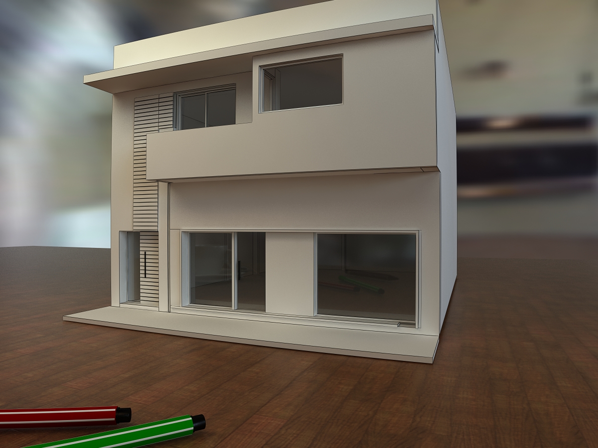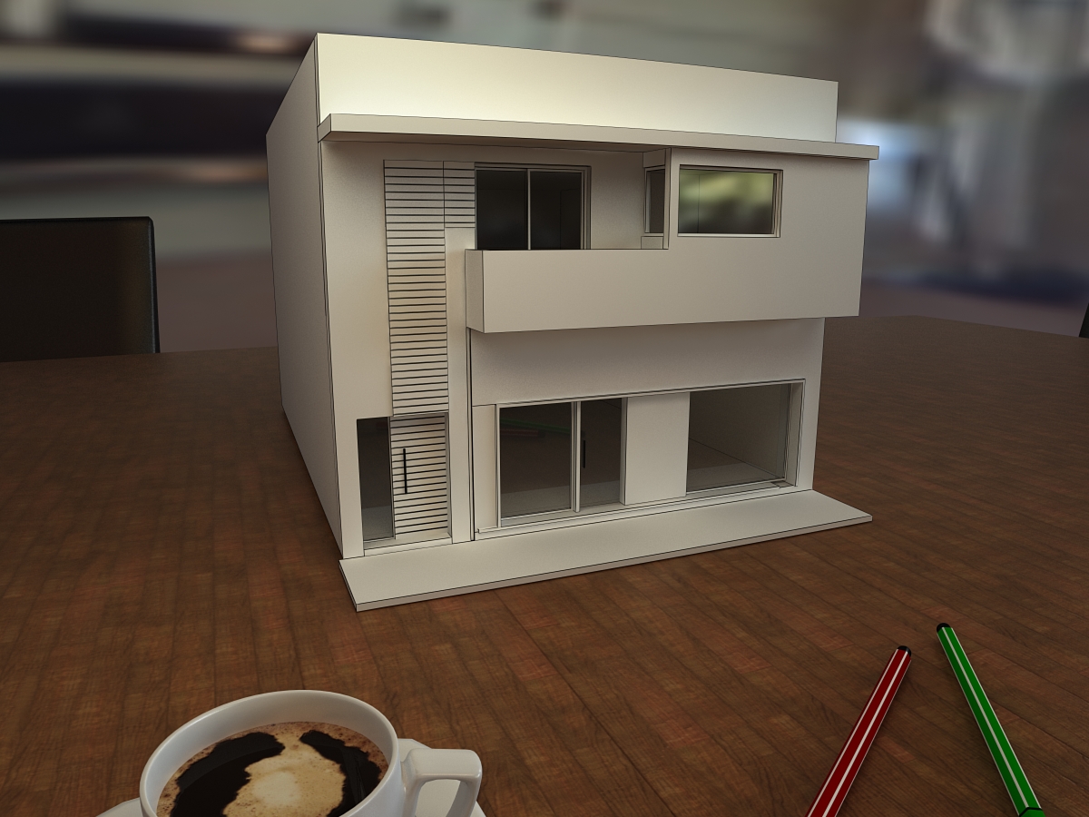Para mí la solución está en trabajar con un color más grisáceo en lugar del color negro de los bordes, tal vez algo de suciedad no vendría mal, pero es un hecho que cuando miro la imagen veo una maqueta sobre una mesa, y creo que esa era la finalidad, por lo tanto es un gran trabajo.