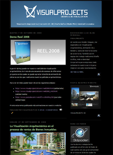 Saludos amigos, como ya algunos conocen, mi trabajo en 3d se especializa en la visualización arquitectónica, realizando animación, renders, plantas y axonometrías principalmente. Este último tiempo he estado trabajando bastante en el website de mi empresa y paralelamente a ello mi blog personal del cual les dejo el enlace del blog; no dejen de visitarlo y comentar, pues ello me sirve mucho para mejorar. Un abrazo.