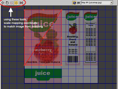 5. En la ventana edit UVWS ir a options>advanced options>find display preferencias y destildar Tile bitmap. Después de eso, clickear ok. Se vera solo una copia de juice.jpg en la ventana de edición de UVW.