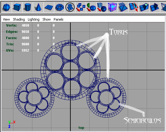 Bien, ahora explico otra regla (nº3): todos queremos hacer un Smooth a todo siempre porque pensamos que el Mesh queda mal tan crudo, y es verdad que parece feo sin smooth, pero realmente no es necesario para lo que estamos haciendo y para cualquier cosa que tenga como base un objeto que no sea smoother (de hecho, el Smooth es más enfocado a lo orgánico). Por ejemplo, si queremos hacer una nave desde un cubo, después de los extrudes, le damos el Smooth que lo hace quedar tan Star Wars 1 la amenaza fantasma(la nave de Obi Wan) y esto hace imposible el texturizado realista. Entonces, ¿Qué hacemos? Es un problema para los que empiezan también, ya que las herramientas indicadas a veces están un poco escondidas. Pero no me quiero perder en otros temas, así que, vuelvo a las ventanas. Estos Torus parecen medio feos así nada más y usar Smooth sería muy inapropiado, así que, hagan lo siguiente si el programa se los permite: a todos estos Torus les vamos a cambiar la subdivisión de altura a 5 (esto hace que el Torus tenga la forma de un cilindro pentagonal (no sé si se dice así) y de eje a 50 (perdónenme, pero está más dirigido a Autodesk Maya, en 3ds Max y en LightWave y en otros programas también están estas herramientas, pero ya me olvide cómo se llamaban en esos programas. Les paso una fotografía así entienden mejor a lo que me refiero con eje y con altura: