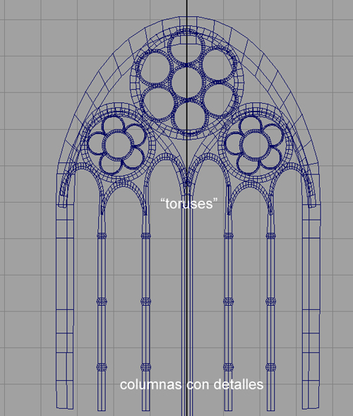 Como pueden ver, el ventanal está compuesto de diferentes partes: las ventanas circulares, los Marcos, y las pequeñas columnas que terminan con un semicírculo arriba, ahora a la práctica: construimos un Torus*(la mayoría de los programas tienen este primitivo) y le damos la escala que más nos guste (recomiendo radio 1 y radio interior 0.1 pero queda a su gusto). Ahora, creen otro Torus, pero este Torus debería ser 1/3 de lo que es el primer Torus (radio.33 y radio interior.033). Este círculo pequeño lo ponen en el centro del círculo más grande, y lo duplican 6 veces. Todas estas copias las ordenan de manera que, haya 3 arriba y 3 abajo (no lo calculé, pero gracias al área del círculo mayor entran 6 más chiquitos de 1/3 más o menos), muy lindo, tienen su primera ventana gótica.
