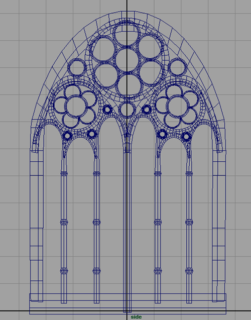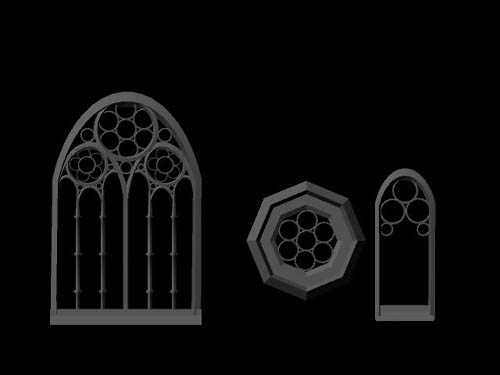 Hacen un grupo con esta ventana, de manera que, pueden mover toda la estructura sin problema. Ahora con la misma técnica hagan otra ventana casi igual a la derecha de la ventana grande, pero los bordes del círculo central hechos de semicírculos (borren vértices o caras, como ustedes quieran)perfecto, dupliquen esta ventana y pónganla a la izquierda de la ventana grande: