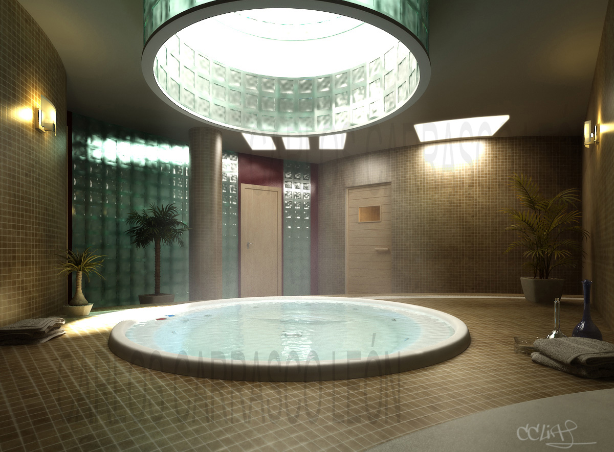 Gracias por las respuestas chicos, me alegro que guste. La textura de suelo, creo que es del mismo tamaño que la pared, o a lo mejor en un despiste le di otro tamaño diferente. El vapor que sale del jacuzzi, lo hice con el Adobe Photoshop, le da un toque especial de ambientación. Saludos.