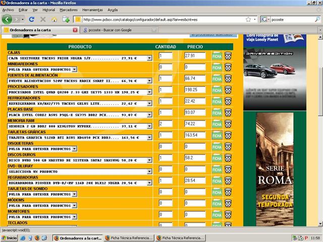 La he hecho en la página de alternate, estoy esperando a ver si alguien me da alguna idea de si me equivocó con algún componente, pero personalmente creo que está bien. He seleccionado 2 Gb de Ram porque Photoshop aún no tiene versión x64 y Windows x86 no acepta más de 3 Gb si no me equivoco. Un Core 2 Duo porque por el mismo precio que un Quad Core tengo 3ghz de velocidad y no sé si merecerá la pena la diferencia de precio con el rendimiento. Y una Nvidia Quadro porque todo el mundo bien de estas para 3d, personalmente nunca he probado ninguna, pero como digo también espero que alguien opine sobre esta configuración. Espero haberte ayudado algo. Un saludo.