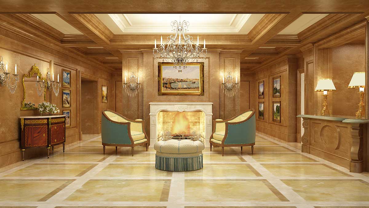 Pues si lo has modelado todo es un curro, solamente esas lámparas ya se lleven un rato, el aspecto general es muy positivo, con la iluminación has conseguido esa ambientación que le queda perfecto a la escena, pero hay texturas muy bien acabadas, como las maderas, suelos, en cambio y en mi opinión, hay otras como el fuego a el mármol (hubiese ganado una barbaridad si le hubieras puesto un poco más de brillo) que se pueden mejorar, sobre todo por la calidad del resto.
