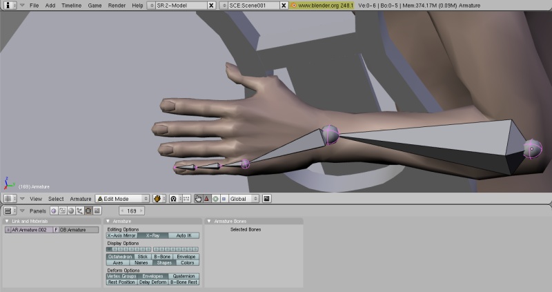 Y así he resuelto parte de las dudas, pero perdiendo mucho tiempo lo próximo será emparentar los huesos entre sí, y la piel a los huesos. Si no os importa subo lo que voy haciendo poco a poco, por si a alguien perdido como yo le sirve de algo. Es lo malo que tenemos los novatos, pero así he aprendido de toda la vida. Leyendo manuales, perdiendo tiempo, y a veces incordiando, aunque no me guste.