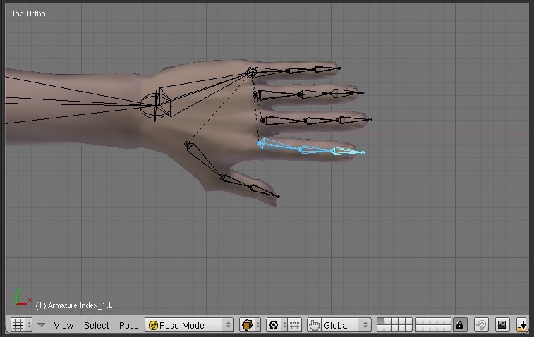 Supongo que primero tengo que crear esos tres huesos o Bones para cada hueso (he probado a seleccionar los 3 del dedo que ya tenía hecho y hacer Control + c y Control + v, pero no me salía así, así que, supongo que, me toca todo, lo que será una paliza). Y después cómo se enlazan con esa línea discontinua los dedos con el meñique. Estoy pez.