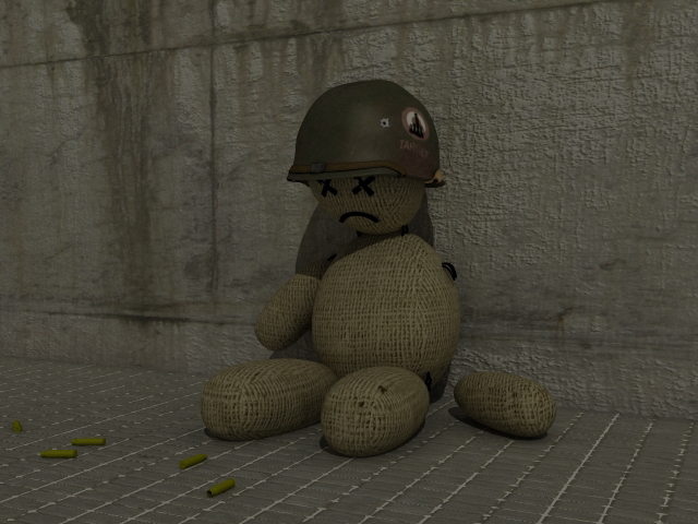 Vaya, cierto está muy bien, que imaginación, bueno por lo demás quizás unas costuras por ahí le hacen falta un rifle quizás a su lado y manchas en la pared como disparos y quizás unas cuantas plumas o restos de algodón cayendo, a ver algo así se me ocurre no estoy a tu nivel, pero así me lo he imaginado.