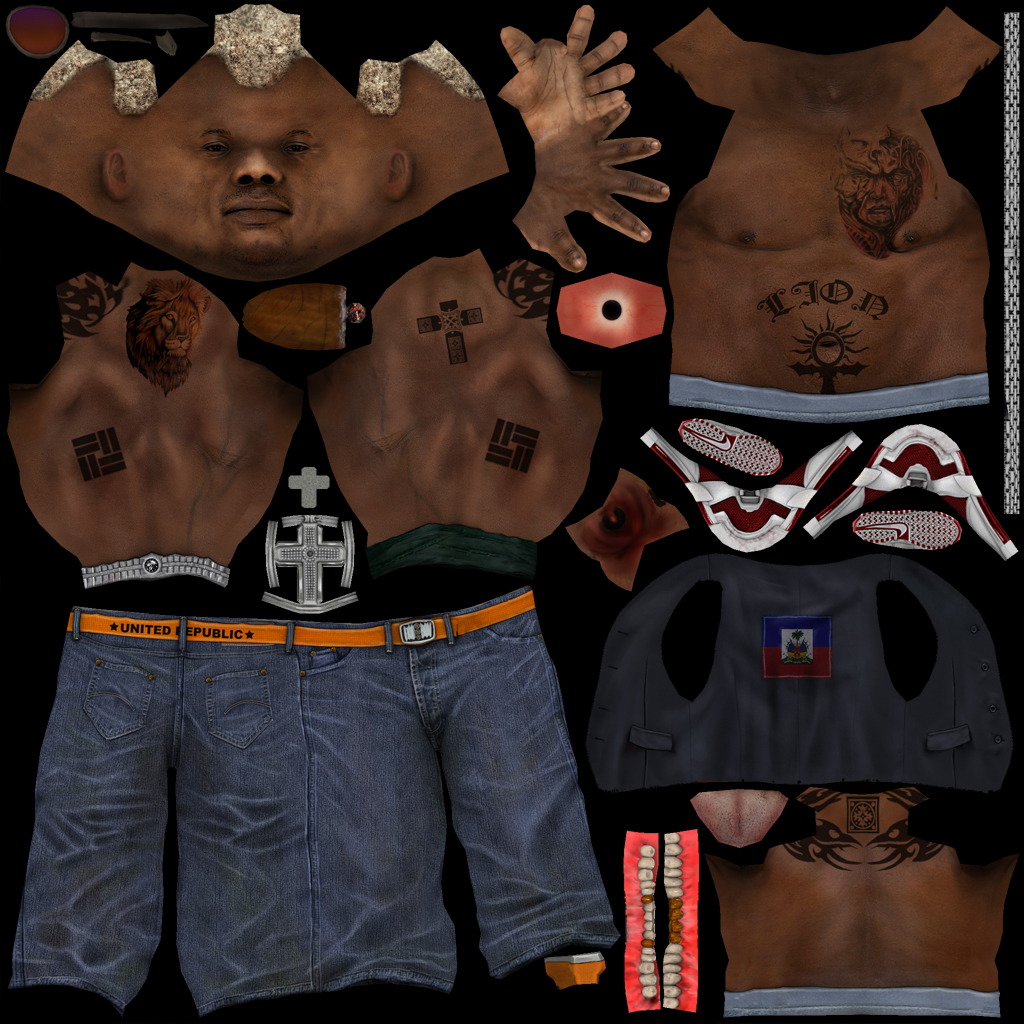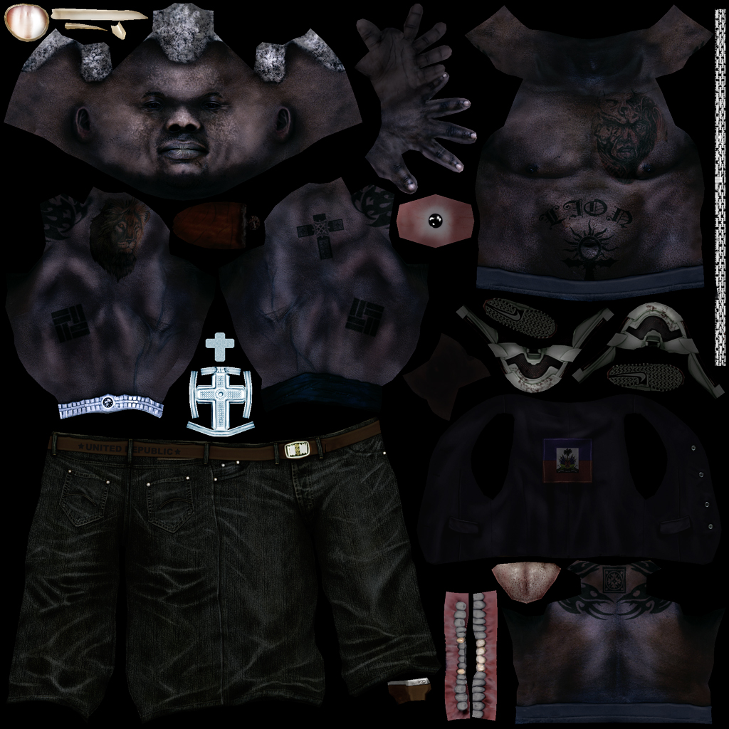 Gracias a todos. El mapa del medio, es el normal para el Bump y el otro para los speculares, brillos. Los tattos ya están rebajados, gracias a YeraY, solo que esa imágenes no están actualizadas, hay, perro que es uno.