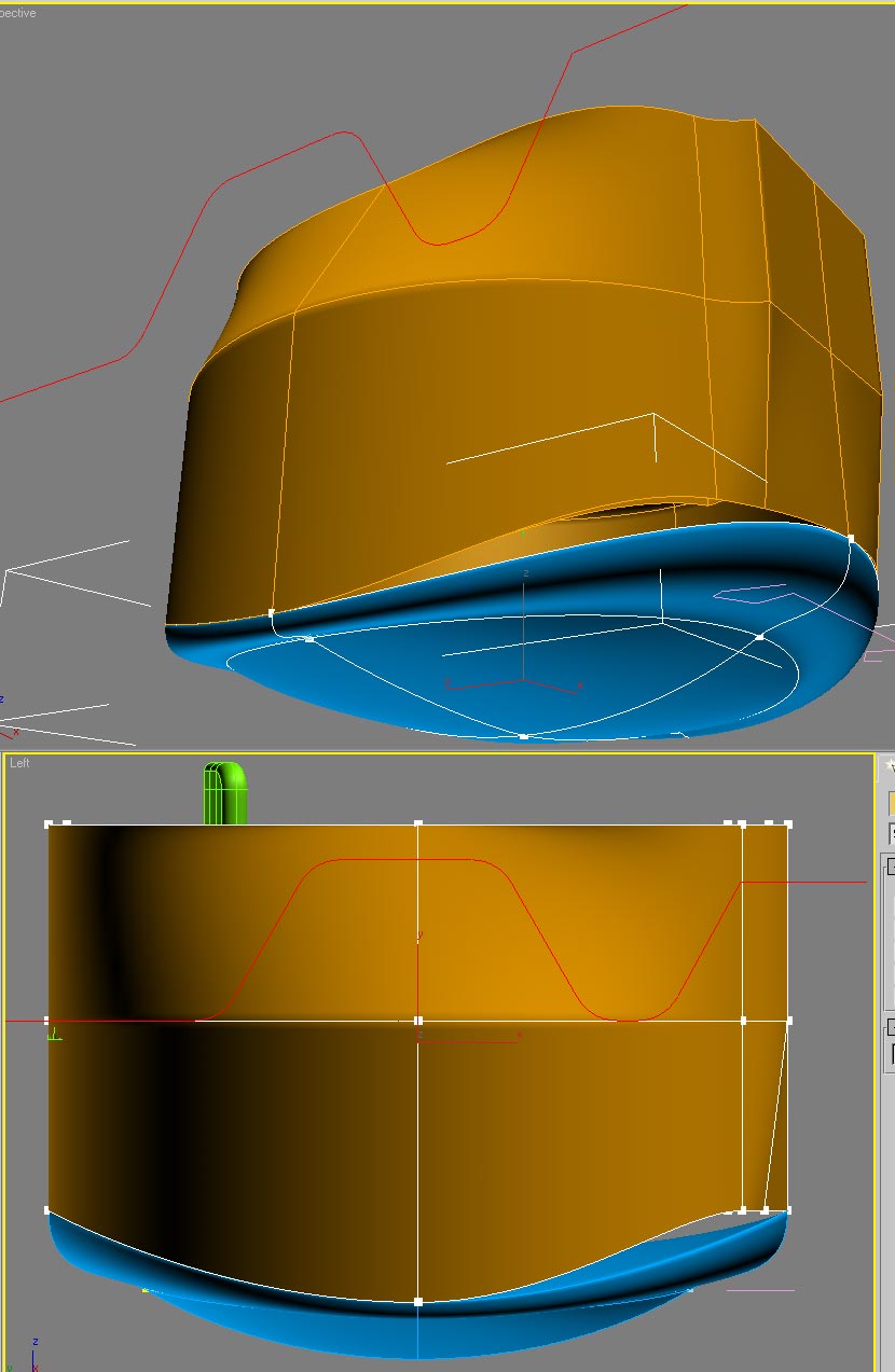 Se puede recortar un trozo de geometría proyectando la Spline roja de la vista lateral sobre el objeto naranjo?