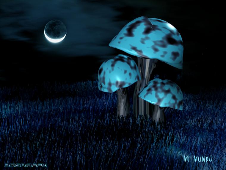 La idea la veo interesante. En mi opinión la hierba puede ser más densa (no tengo experiencia en Blender y por esto no sé de qué es capaz)pero si me gusta como todo ha quedado la luna. Probablemente sería más interesante si pones un efecto Glow suave del mismo color que la seta dentro de ella y duplicarla unas cuántas veces y ponerla detrás en la oscuridad para que se vea en la noche y también puedes poner en Adobe Photoshop si quieres algo de polvo que brilla en el aire alrededor de las setas o insectos que brillan en la oscuridad. Para mí esta imagen tiene muchas posibilidades. Te deseo suerte (y perdón si llevo muchos errores, pero llevo mucho tiempo sin dormir y ya no veo bien las teclas del teclado).