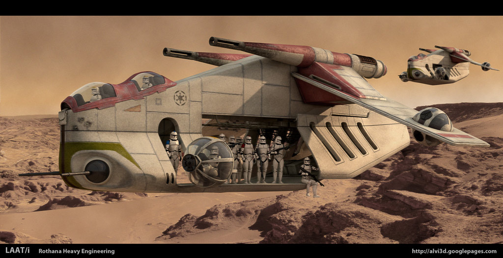 Sobre lo de la postura pues lo mismo que antes, está a punto de tomar tierra por eso lleva el portón abierto, si te fijas el lat de más atrás todavía no ha iniciado la aproximación para tomar tierra, va más rápido y por eso lleva los portones cerrados. De todas formas, si te fijas en la película estos clones tiene un equilibrio brutal ninguno va agarrado ni aún con la nave de lado, yo he tenido un poco de consideración con el que va sentado y lo he puesto agarrado al portón, porque en esa postura cualquier movimiento se va abajo, aunque en la película salen sentados y sin agarrarse. Sera que tienen las botas y el culo un campo magnético que les deja pegados al suelo?