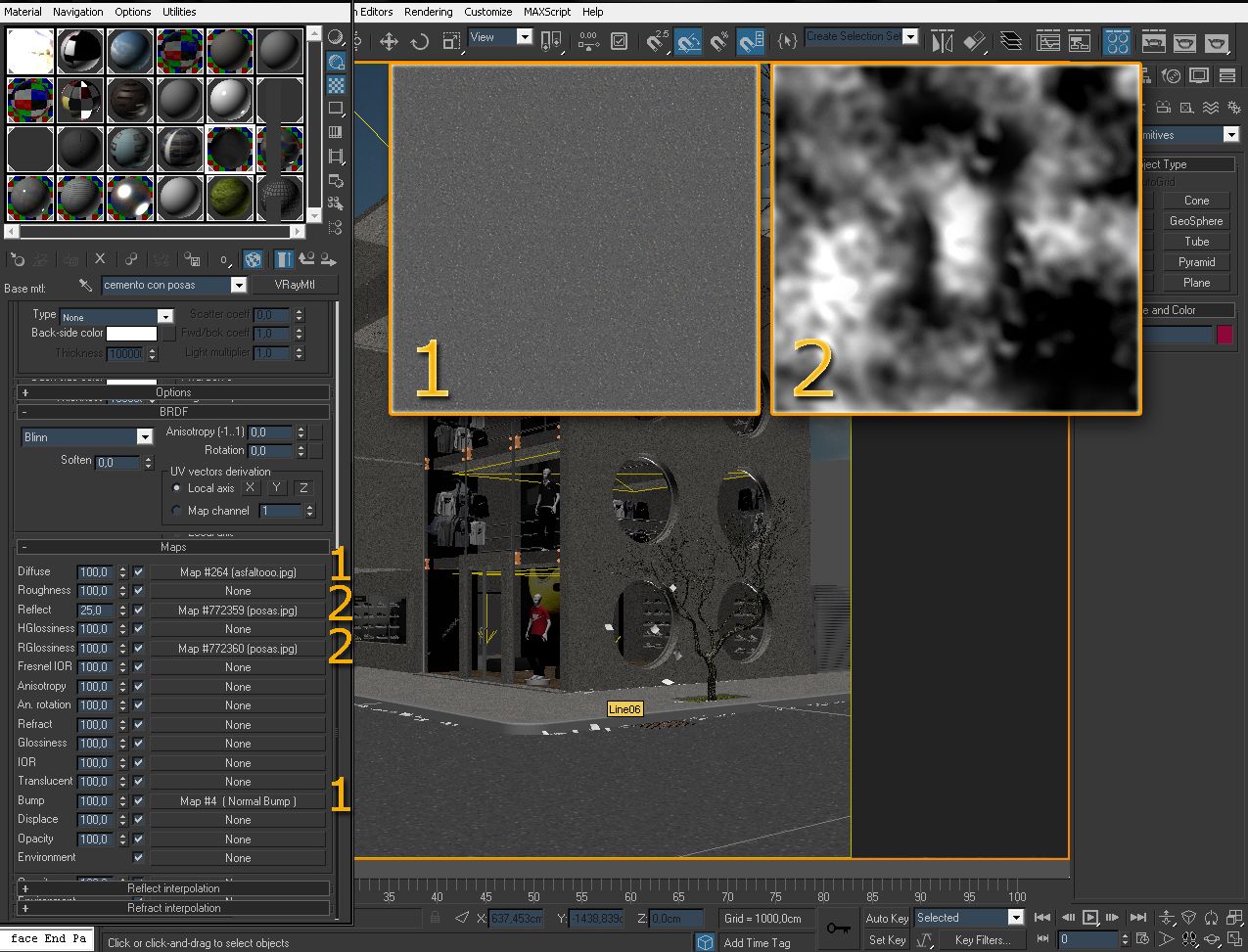 Sobre los charcos de agua me lo enseñaron, me mostraron un pantallazo y me pasaron los mapas y los aplique, en http://www.vray-materials.de/ creo que hay también, hace un tiempo baje unos de ahí, pero me arrojaba un error.