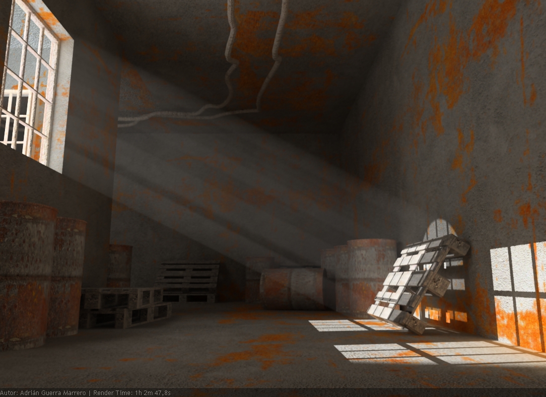 Me gusta cómo va quedando el render, pero lo que me hace ruido es el haz de luz entrando por la ventana. Y quedaría bueno unos metales corroídos o un poco más de mugre.