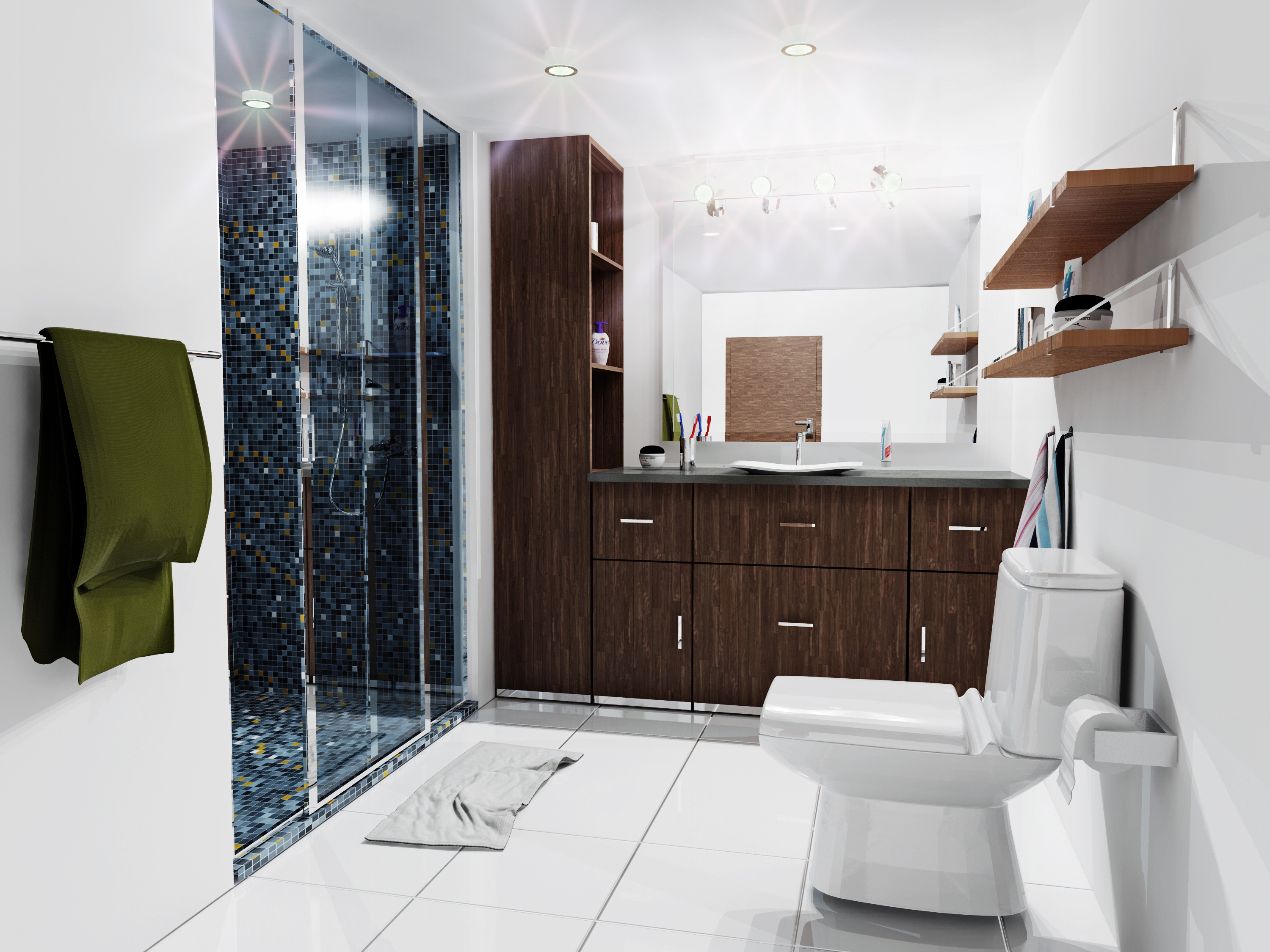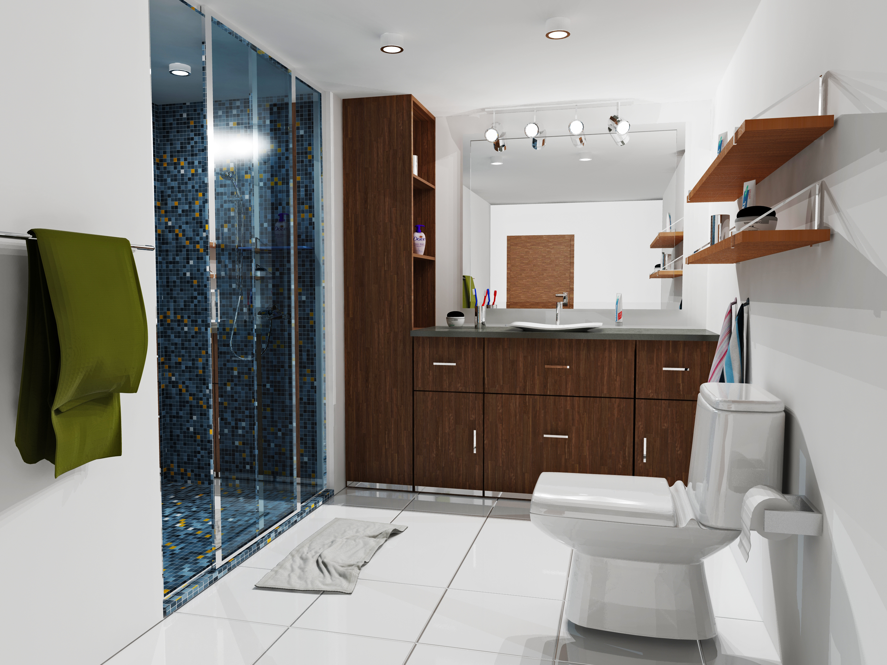 La iluminación la veo un poco dura, sin contar con que parece que no lleva nada de mensajes. En el tema de las texturas has de darle más caña ya que el gresite de la zona de ducha en el escalón de acceso está mal tileado y se ven rectangulares en vez de cuadrados como supongo que, son y el material de lejas, muebles y puerta son el mismo creando un que se yo que no me encaja, busca referencias reales y trata de imitarlas, ganaras realismo.