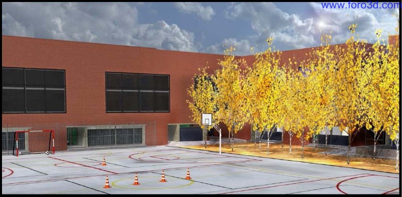 Los exteriores diurnos son espacios en los que la fuente de luz suele ser el sol y el cielo. El sol es una luz directa en la que todos los rayos provienen de una misma dirección, en cambio la luz del cielo es una luz que viene de todas partes del cielo, creando un foco de iluminación más débil que el sol con forma de semiesfera. Por estas características, en los exteriores existe mucho contraste en los días que no está nublado debido a que las caras que están enfocadas hacia el sol están mucho más iluminadas que las demás, pero, sin embargo, los días nublados la luz viene de todas partes del cielo por igual con lo que se consigue una iluminación tenue y con muchas sombras de ambiente, pero uniforme. La combinación sol-cielo produce una iluminación más impactante que la de los días nublados gracias a los juegos de sombras, las caras de la geometría quemada y las líneas rectas que producen las sombras, aunque el sol varíe de intensidad a lo largo del día. Es por ello que al renderizar exteriores es mucho más impactante y artístico dotarlos de una luz diurna con sol en plena intensidad (al mediodía o media tarde). El IES Banús es muy grande y muchas de sus paredes suelen estar compuestas solo de tochos y grandes ventanales, por la cual cosa si el render se hiciera en un día nublado quedaría todo demasiado monótono. La siguiente imagen muestra el juego de espacios quemados y sombras a la perfección: el suelo y la tierra están muy quemados y la mayoría de sombras pintan la geometría en diagonal para no caer en el absurdo de que las sombras fuguen al mismo punto que la geometría, con la cual cosa se conseguiría una composición sin sentido ya que quedaría la imagen descompensada artísticamente.