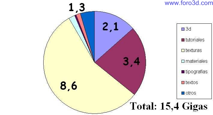 En total el peso de la información obtenida (tutoriales, texturas, textos, archivos de geometría 3d, tipografías, materiales.) ha sido de 15.362 megabyte (15,4 gigas) distribuidos de la siguiente manera: