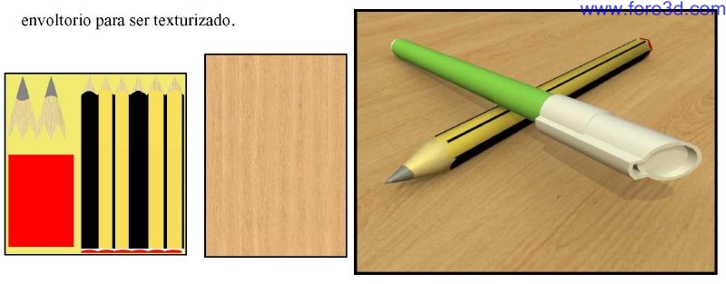 Finalmente lancé el render para obtener la imagen final (infografía) fotorrealista. En este caso en concreto solo texturicé el lápiz y la mesa, ya que el rotulador está compuesto por colores planos. La textura de la mesa es una imagen (*.jpg) de una madera mientras que el lápiz utiliza el modificador envoltorio para ser texturizado.