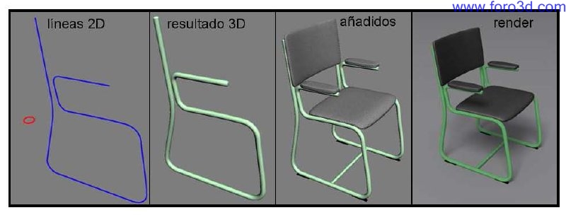 Aunque 3dsMax es una suite enfocada a las 3 dimensiones, también es posible modelar objetos en dos dimensiones. Estos objetos en dos dimensiones como líneas o círculos no se renderizan al no tener una superficie definida. La utilidad de estos objetos 2d la encontramos cuando los combinamos entre ellos. Por ejemplo, todo el entramado de metal de las sillas y mesas para estudiantes del i. E. S las realicé mediante una operación (combinación) entre dos objetos en 2 dimensiones. La operación consiste en marcar un objeto como camino y el otro objeto como forma para que se distribuya la forma por el camino, consiguiendo así un nuevo objeto en 3 dimensiones bastante preciso.