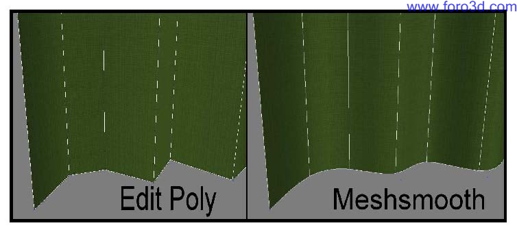 Algunos objetos como superficies curvas muy suavizadas serían extremadamente difíciles de modelar por la gran cantidad de curvas que tienen y lo suavizadas que están, como en el caso de las cortinas. Para hacer las cortinas, primero modelé un modelo poco detallado y después le apliqué el modificador MeshSmooth. Este modificador suaviza la malla (polígonos) añadiendo geometría adicional mediante una función matemática.