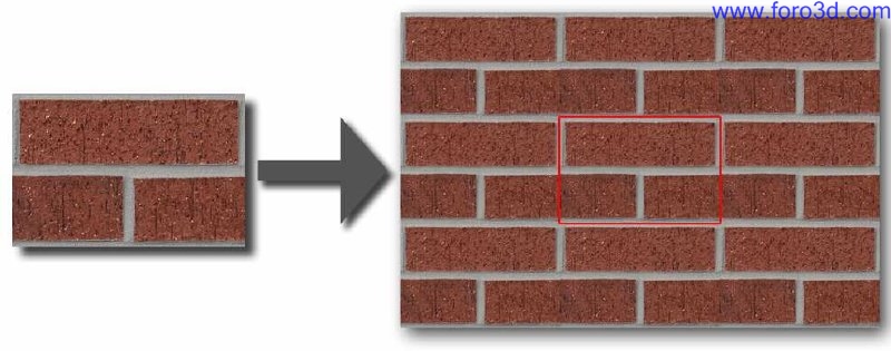 Cuando se trata con superficies grandes, como una fachada de ladrillos, no es recomendable crear una textura general de toda la fachada repleta de ladrillos, porque para conseguir una buena calidad de la imagen se tendría que generar un tamaño y resolución desorbitados que muy posiblemente un ordenador de gama media-alta no sería capaz de soportar. Para simular este efecto se utilizan las texturas con un efecto mosaico. Una textura con un efecto mosaico es una textura que se repite de manera infinita por toda la superficie donde ha sido aplicada. Con esta técnica es posible recrear una fachada de ladrillos con una imagen de tan solo 3 ladrillos que se va a repetir por toda la fachada. El efecto mosaico no solo es aplicable a los ladrillos, sino que se usa con la mayoría de texturas, maderas, baldosas, paredes, parquet, hierba, arena, telas, etc.