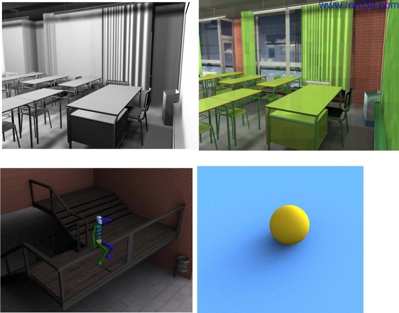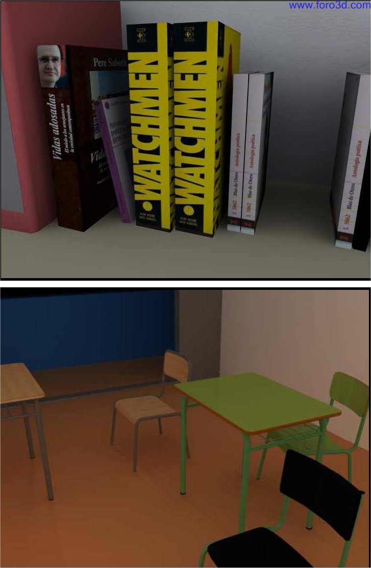 Una vez captada toda la información de los tutoriales hice la mitad de la parte practica, que consistió en crear todos los objetos del i. E. S: mesas, ordenadores, ventanas, puertas, cortinas, armarios, árboles, enchufes, interruptores, radiadores, fluorescentes, en archivos separados. Una vez creado todo el mobiliario (5 meses de trabajo) empecé la segunda parte del proceso practico.