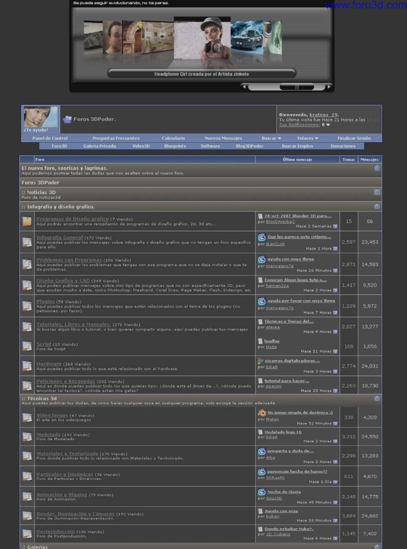 Mi primera toma de contacto con la infografía fue en un boletín de noticias por e-mail. En el se explicaba como hacían los desarrolladores de un videojuego para modelar y texturizar un personaje. Era verano, y tenía bastante tiempo libre, con lo que me dije: ¿porque no probaré y así fue. Me descargué el programa con el que los desarrolladores habían hecho ese personaje, pero al abrirlo, casi me desmayé. Aquel programa, no era como el Paint o tenía un botón que decía: crear personaje chulísimo. No, eso no fue así, y durante mis primeras 2 horas cara a cara con 3dsMax 7(programa para crear gráficos 3d), solo conseguí hacer una caja verde. Realmente no fue aquel e-mail lo que me incitó a seguir con aquel programa. Fue cuando descubrí la ingente cantidad de material que había por la red del mismo. Así pues, mirando tutorial tras tutorial sin entender la mitad de ellos al principio fui aprendiendo a hacer redondas, cilindros, sillas, casas, etc.