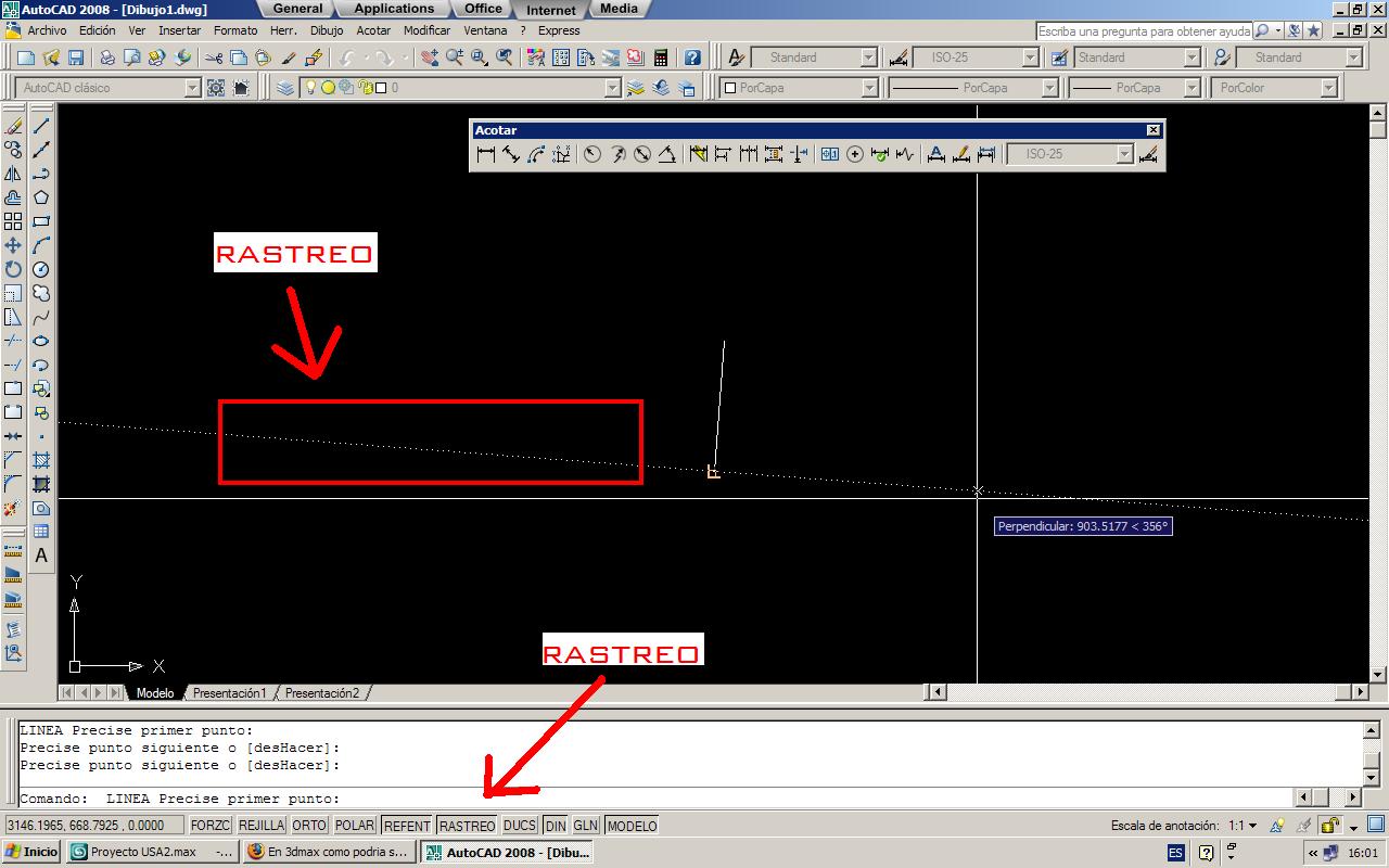 Vaya, nunca usé el AutoCAD en español, rastreo es Snap, en 3dsmax, se activa con la s. Activación de alguna opción momentánea, shift + botón derecho del mouse.