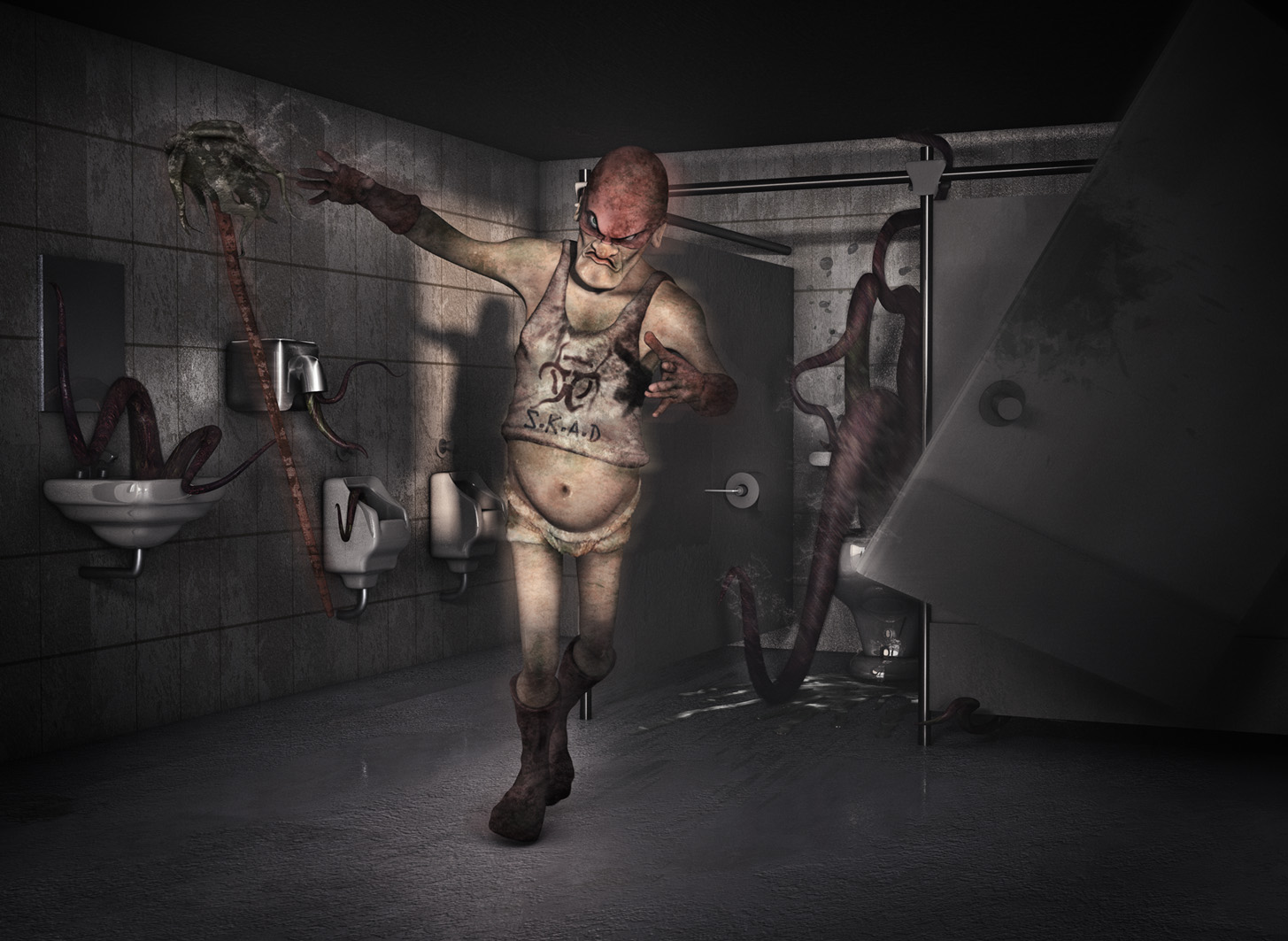Ahora si que se ve la escena con más acción aunque en mi opinión se podría poner un poco más de cosas en la escena. Algo como, una papelera llena de basura cerca del lavabo, un poco de agua que cae desde el techo, pero sí que se nota mucho la mejora respeto la última escena. Buen trabajo.