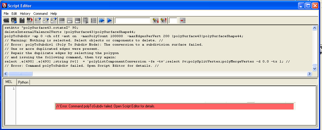 Hola chicos. Estoy teniendo problemas con una objeto poligonal que no me deja convertirlo en subdivisiones, por alguna razón me está rechazando la subdivisión, me pone un error y me dice que mire el script, he subido los niveles del máximo based Mesh Faces a 100000y el valor que le sigue ni aun así me lo subdivide, este objeto son dos cilindros unidos por sus vértices y cuatro Edges con bridge, eso es todo lo que hice, le di a convert to subdividido y nada, dejo imágenes para que lo observen gracias de antemano. Un saludo.